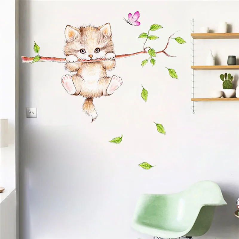 Gato Dos Desenhos Animados Primavera Folha Verde Adesivo De Parede