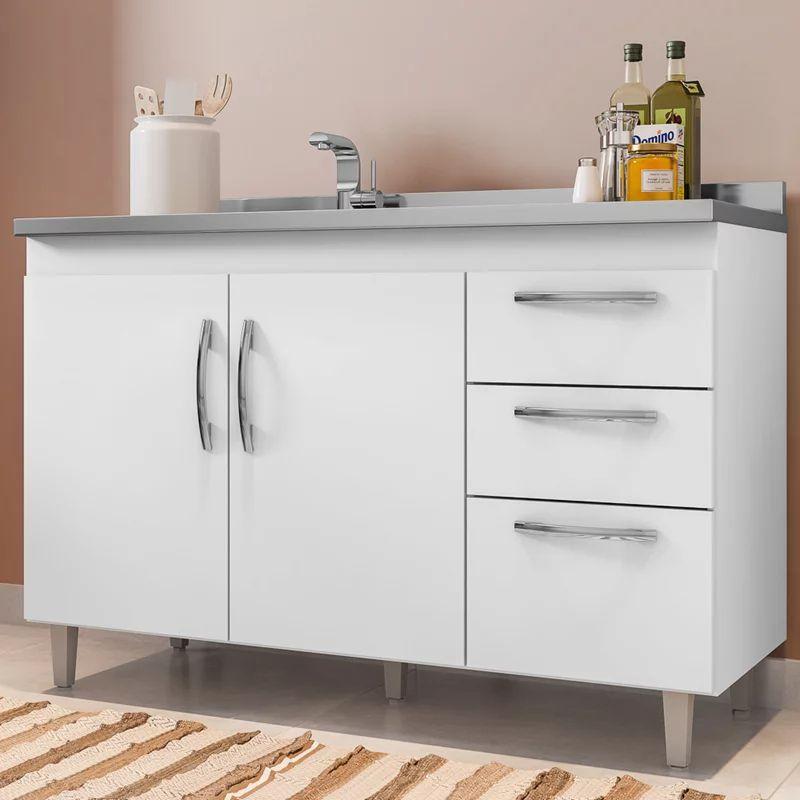 Balcao Gabinete Pia Inox 120cm Elisa 3 Portas Branco Ajl Moveis