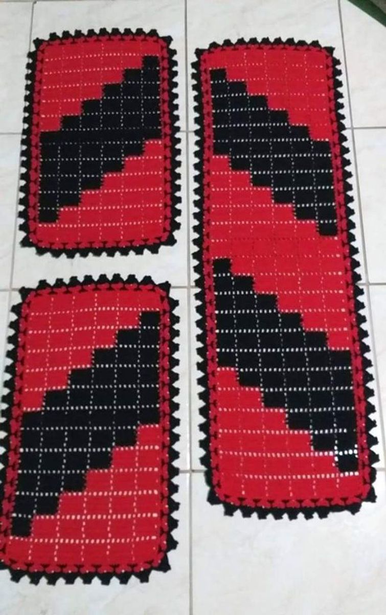 Jogo De Tapete Croche Para Cozinha 3 Pecas Vermelho C Preto