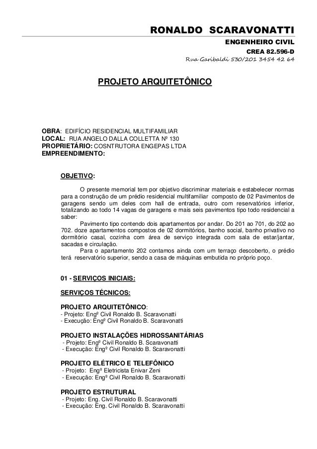 Modelo De Memorial Descritivo Projeto Arquitetonico Docsity