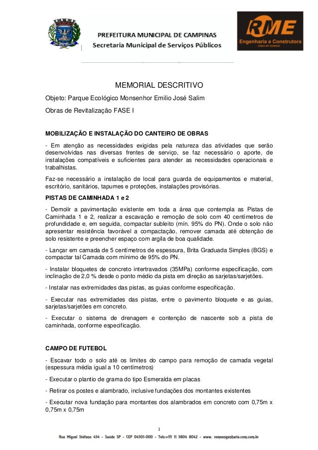 Memorial Descritivo Execucao De Obras De Revitalizacao Do Parque Ecol