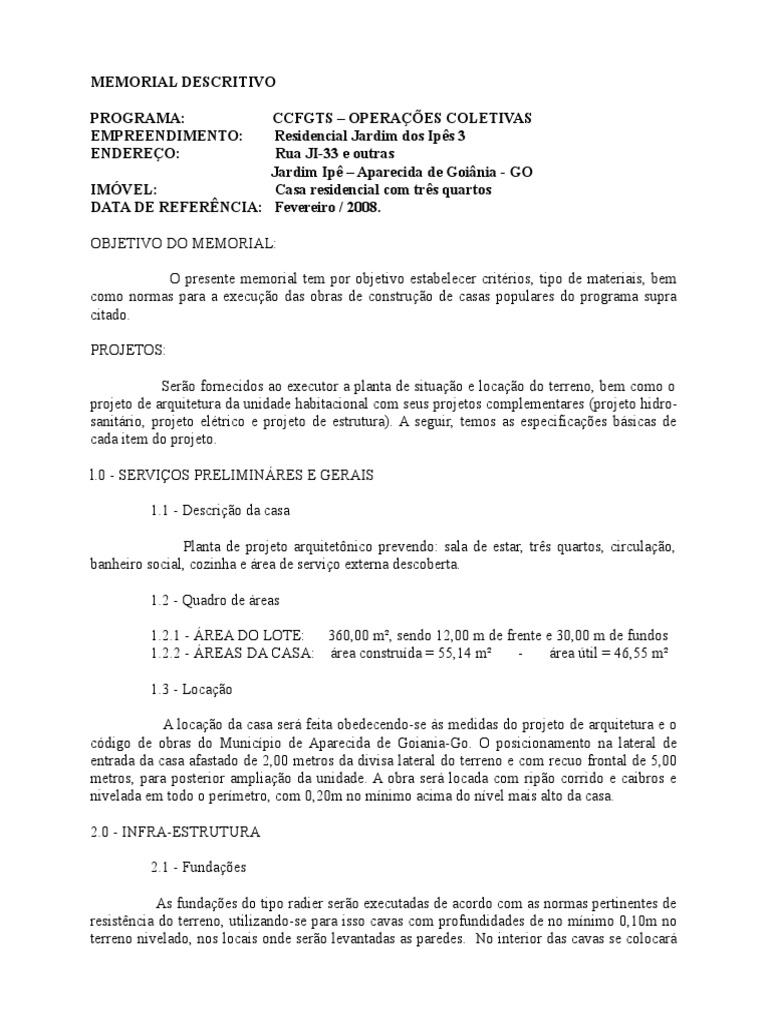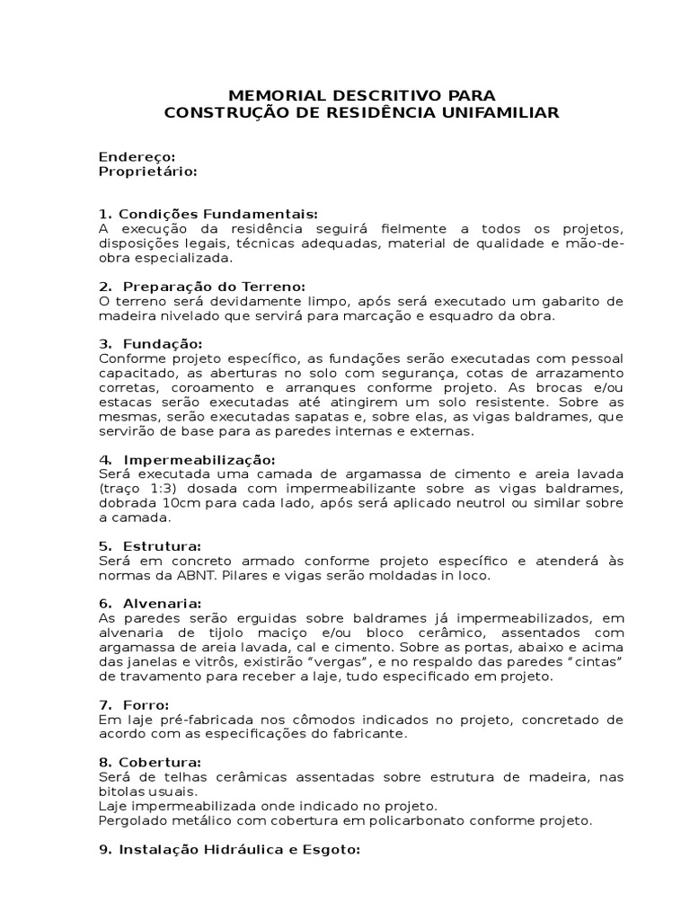Modelo Memorial Descritivo Residencial Planejamento De Obras